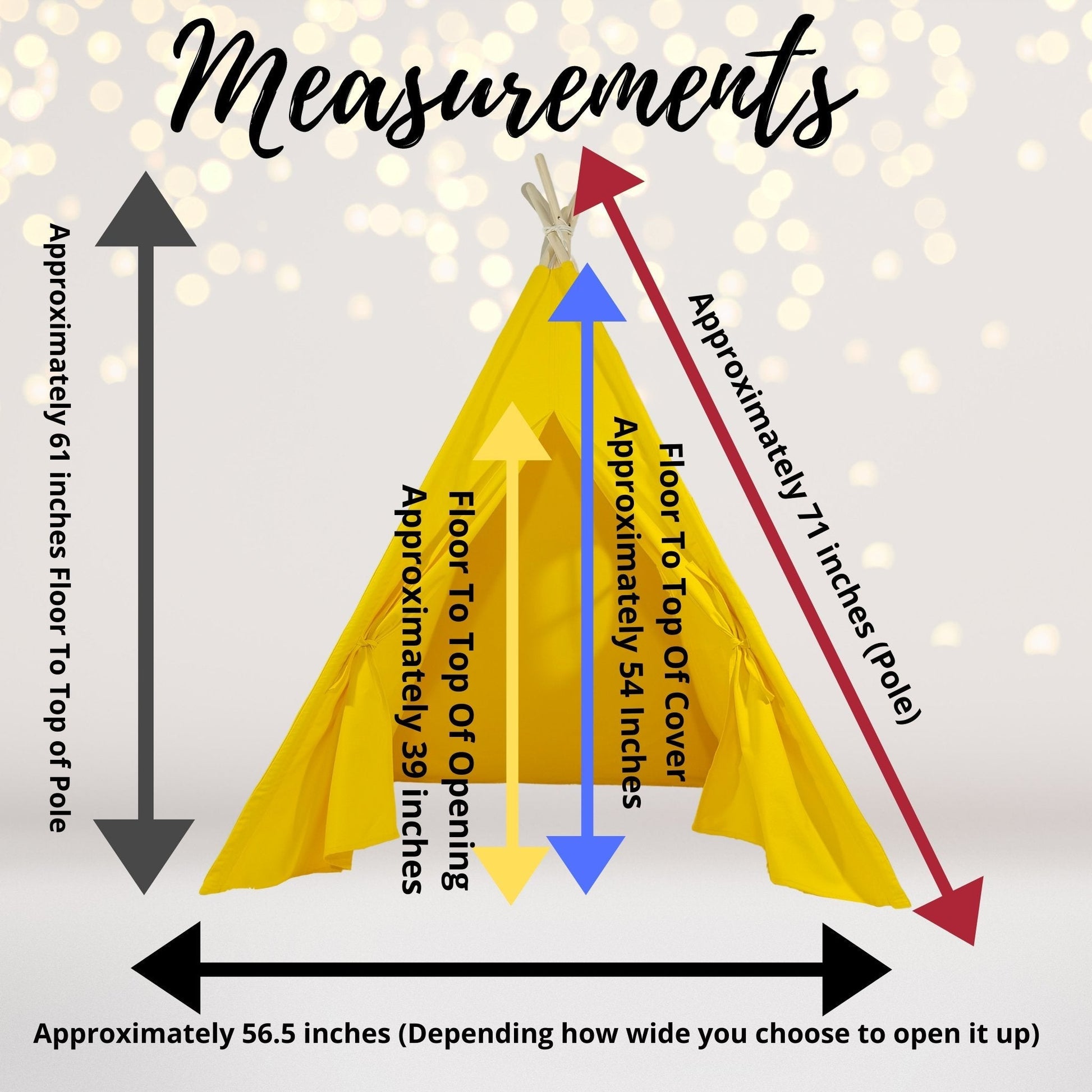 - The dimensions of our bright yellow play tent teepee are a good size measuring approximately 71x56x61 inches. The width of the play tent door is approximately 56.5 inches. The height of the teepee tents door opening is 39 inches tall. Our kids teepee has enough space for 2 children to play in at one time. Thus allowing your kids all the space they need to invite their plush friends inside for a fun and fabulous tea party.